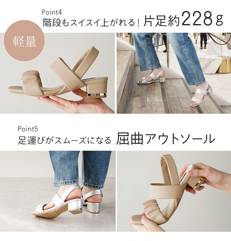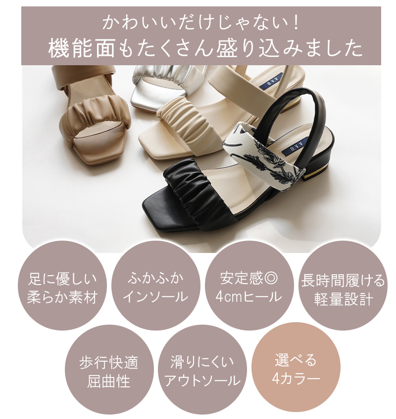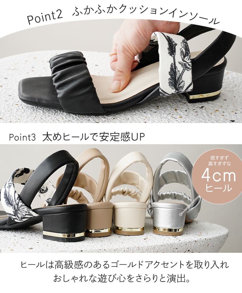 ギャザー入りストラップが足元を華やかに彩り、4cmの太ヒールで安定感も抜群。