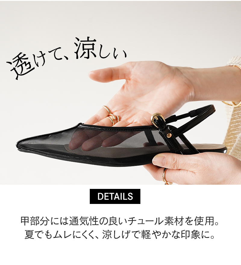 透け感のあるチュール素材と、足元を美しく見せるすっきりとしたシルエットを組み合わせた、大人のためのスリングバックパンプス。バックストラップが足をしっかり支え、安定感のある履き心地も魅力。デニムやワイドパンツなどのカジュアルスタイルから、ワンピースやきれいめな装いまで、春夏のコーディネートに自然になじむ一足です。