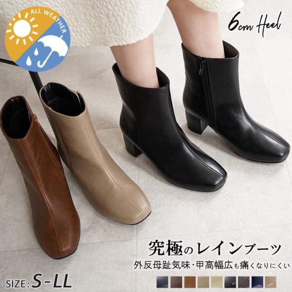 レインブーツ ブーツ 防水ブーツ 6cmヒール スクエア 太ヒール レディース ミドル丈 雨用 ショート 防水 痛くない 外反母趾気味 甲高 幅広 アレッタ 送料無料