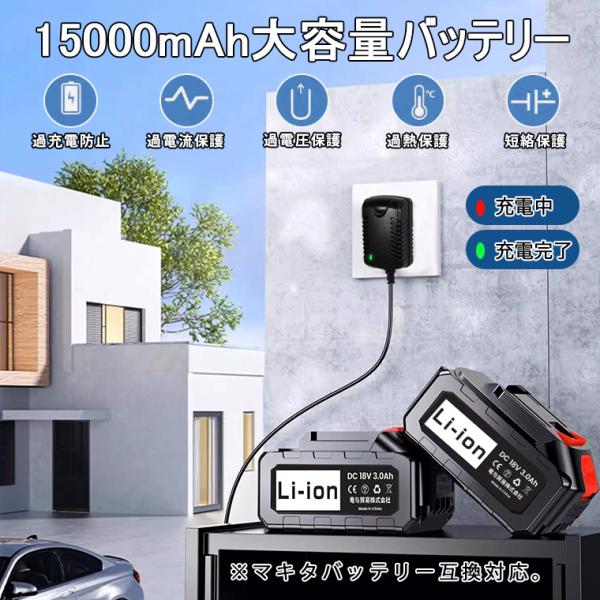 15000mAhのバッテリー搭載で、約20〜30分の連続使用が可能。充電池・充電ケーブルともにPSE認証済みで安全性も確保。日常の掃除から屋外使用まで安心してお使いいただけます。