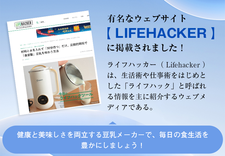 豆乳・豆腐・ナッツミルク・離乳食・ジュース・スープ・ソースまで、これ一台で自由自在。忙しい朝も、健康志向の夜食も、ボタン一つで完成。日常の「食」がぐっと豊かになります。さらに日本食品衛生法認証済です。