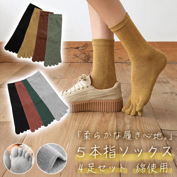 5本指ソックス レディース 4足セット 黒 黄 ブラウン カーキ 緑 赤 茶 ブラック 吸水性 コットン無地 ポイント利用 爆買