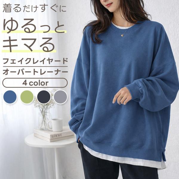 トレーナー レディース スウェット フェイクレイヤード 重ね着風 長袖 オーバーサイズ ゆったり 体型カバー ボリューム袖 無地 トップス プルオーバー