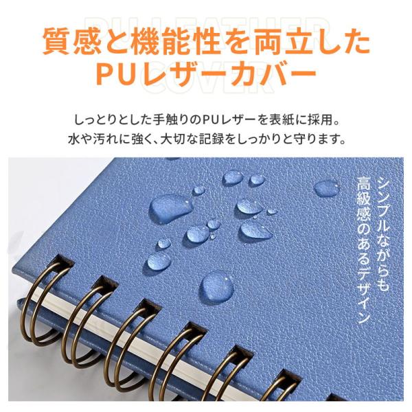 表紙には、水や汚れに強いPUレザーを使用。本革のような上品な風合いでありながら、お手入れが簡単なのも嬉しいポイントです。シンプルで高級感のあるデザインが、大切な記録を守りながら、持つ人の印象を引き立てます。