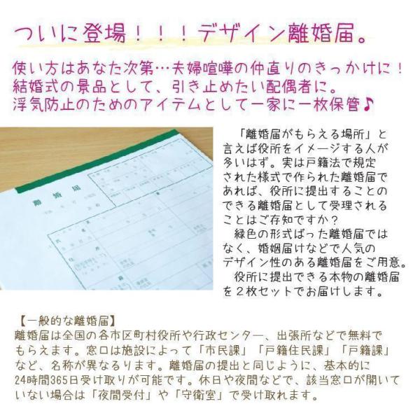 「離婚届がもらえる場所」と言えば役所をイメージする人が多いはず。実は戸籍法で規定された様式で作られた離婚届であれば、役所に提出することのできる離婚届として受理されることはご存知ですか?緑色の形式ばった離婚届ではなく、婚姻届けなどで人気のデザイン性のある離婚届をご用意。役所に提出できる本物の離婚届を2枚セットでお届けします。