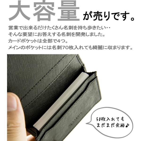 仕様:カードポケット4つ。メインポケットは名刺70枚収納可。