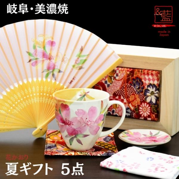 2026 母の日 食器 プレゼント ギフト 3種類の花柄から選べる 夏ギフト 5点セット マグ ハンカチ 扇子 コースター 小皿 ちりめん木箱入 母 お母さん 義母
