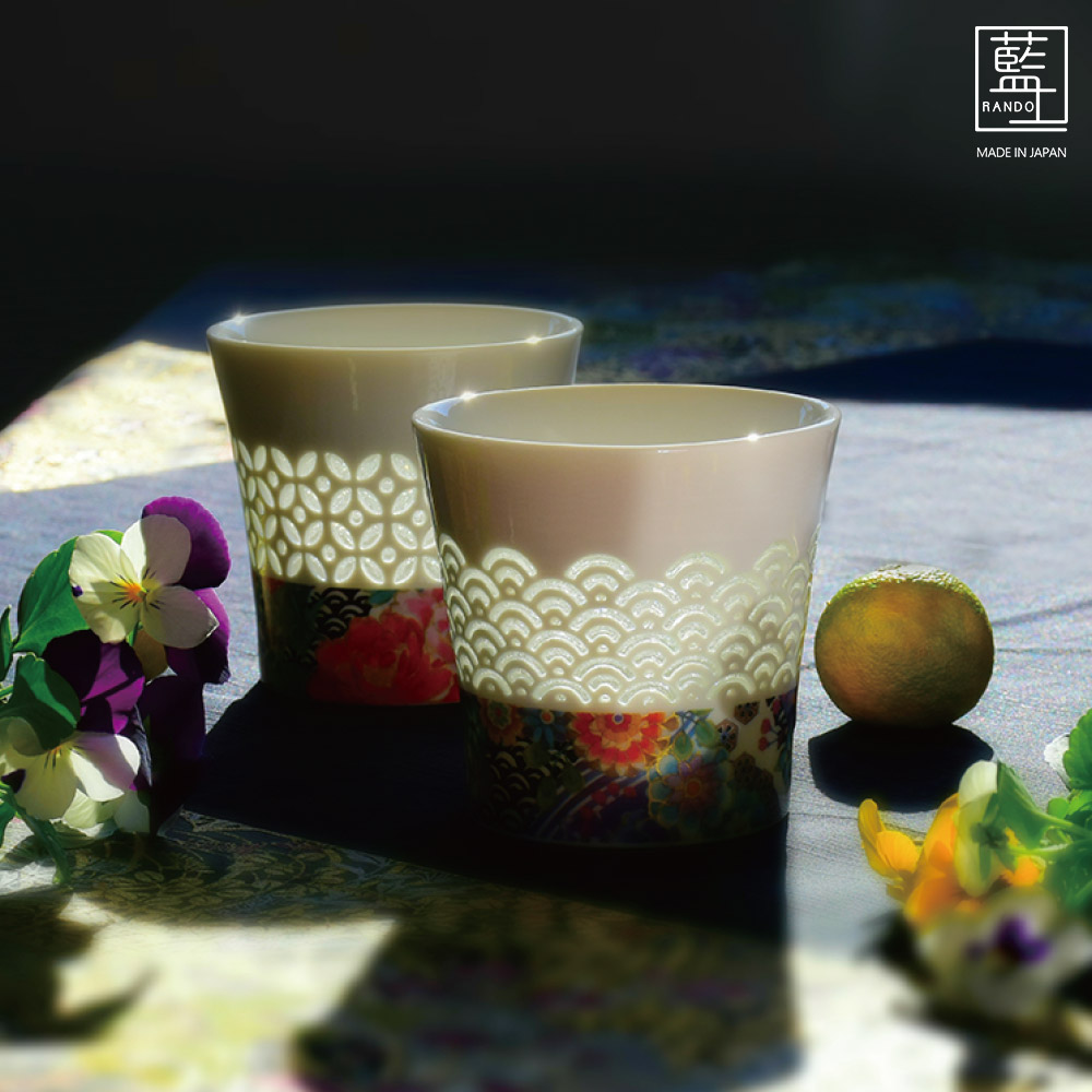 青海波と七宝柄の小紋の窓は光を透かし、また飲み物の色を愉しめます。