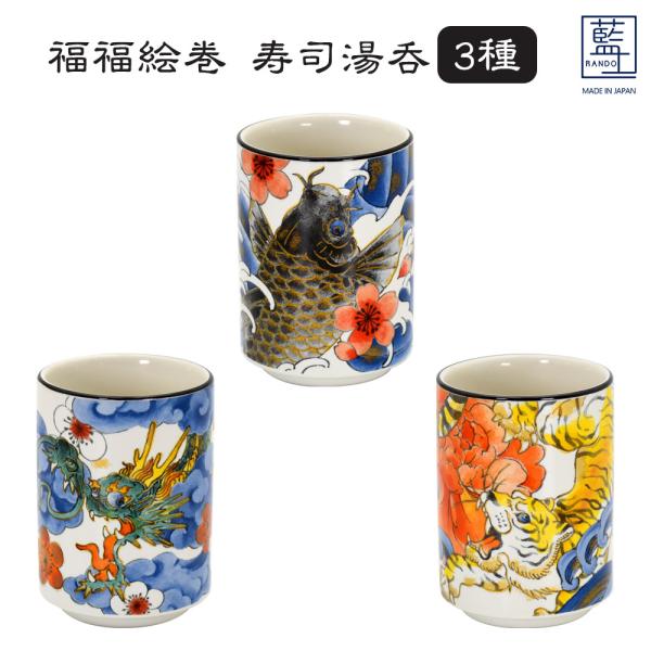 美濃焼 福福絵巻 寿司湯呑 単品3種 日本製 湯呑 和食器 和風 食器 モダン レトロ 古風 ギフト 贈り物 新築 結婚 御祝 プレゼント食器 陶器 セラミック藍