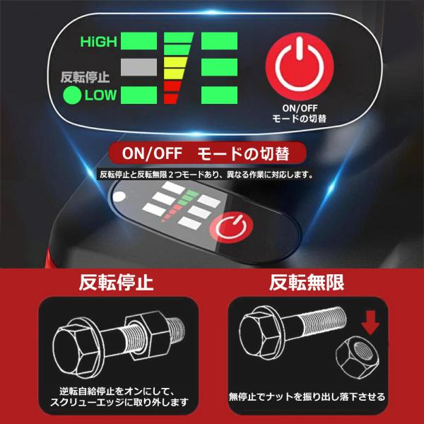 逆回転(緩める時)状態で機能スイッチを押すと、ランプがついた状態では約0.5秒後に自動停止します。