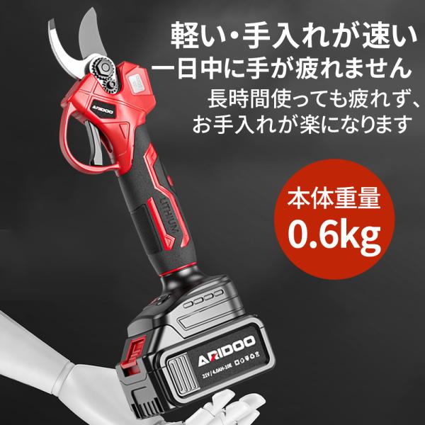 電動剪定ハサミはブラシレスモーター付きの新型電動ハサミ です。安定した性能、高速回転、優れ耐久性と長寿命の特性がります。直径10 20 30 50mmまでの切断が可能です。スーパーパワーで、太さ50mmの枝も1秒で切断できます。コードレス充電式剪定ハサミ、電源が不要であり、様々な場所で使用することができ、場所の心配がありません。