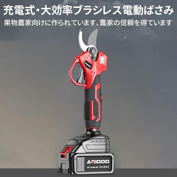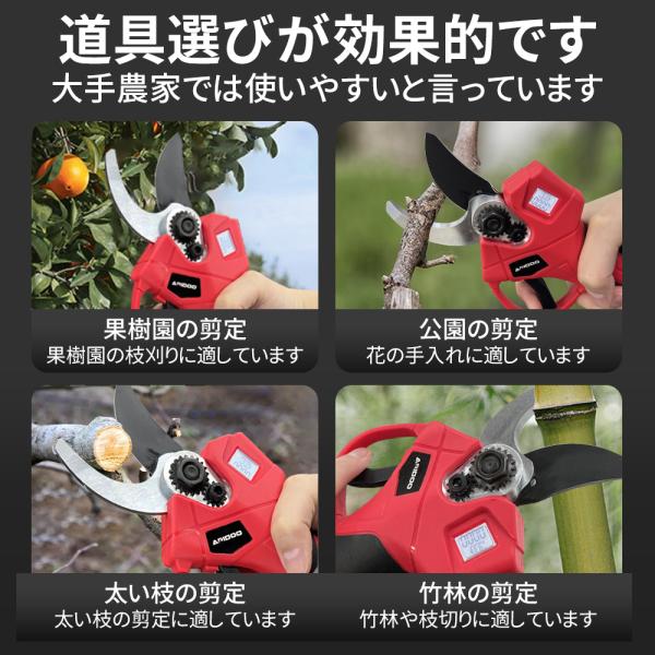 電動剪定ハサミはブラシレスモーター付きの新型電動ハサミ です。安定した性能、高速回転、優れ耐久性と長寿命の特性がります。直径10 20 30 50mmまでの切断が可能です。スーパーパワーで、太さ50mmの枝も1秒で切断できます。コードレス充電式剪定ハサミ、電源が不要であり、様々な場所で使用することができ、場所の心配がありません。