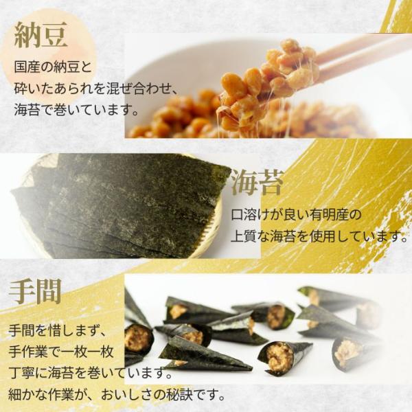 乾燥納豆とあられと辛子を手巻き風に海苔で巻いたお菓子です。