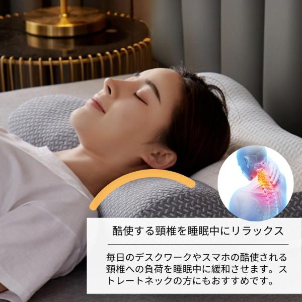 この枕は頸椎にぴったりとフィットし、姿勢を安定させ、首や肩をサポートしてくれます。