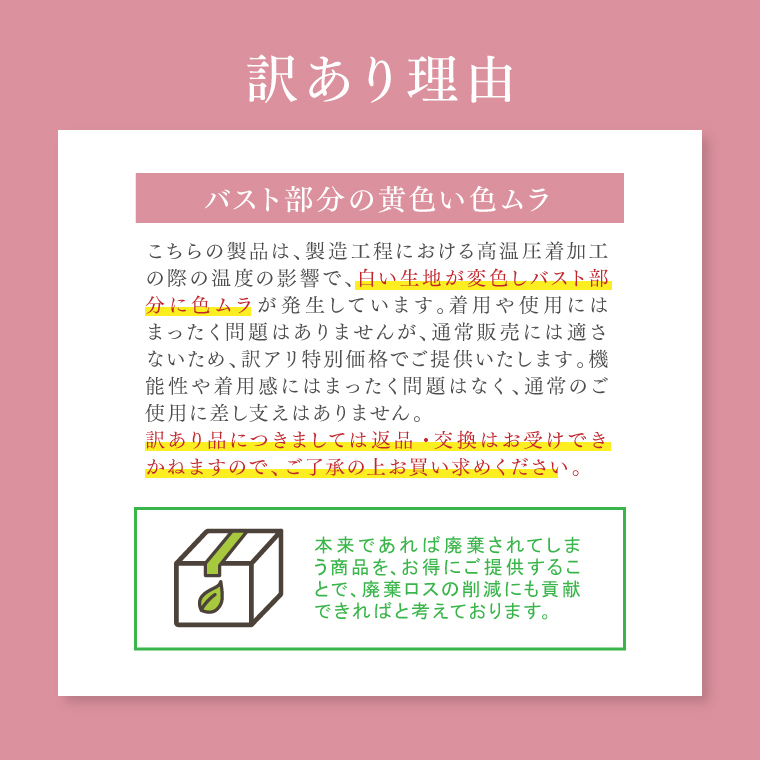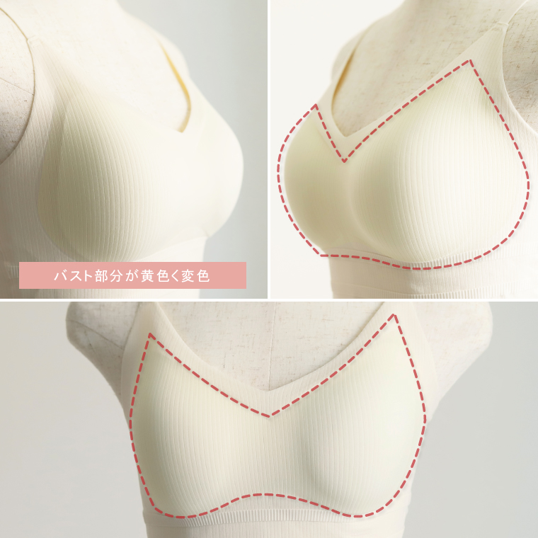 製造工程における高温圧着加工の際の温度の影響で、白い生地が変色しバスト部分に色ムラが発生しています。