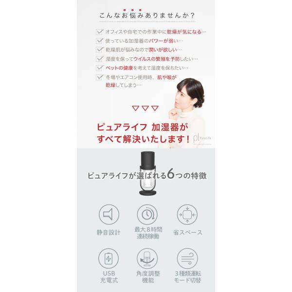 加湿器 コンパクト 除菌 静音 海外対応 簡単 黒 かわいい オフィス 次亜塩素酸水 おしゃれ 電源不要 小型 給電 持ち運び 充電式 お手入れ不要 大容量 卓上 USB