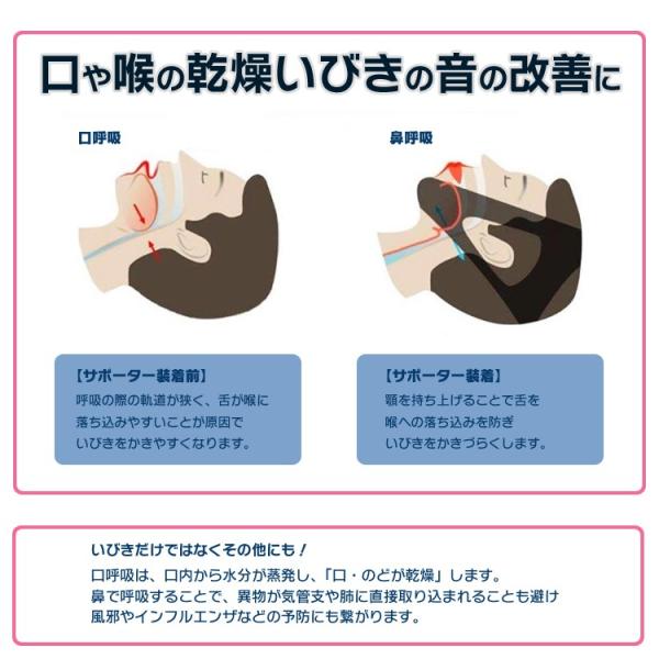 就寝時の開口呼吸癖に多い、いびき、のどの渇き、起床時のノドの乾きなどを防ぎ、鼻で正しく呼吸する鼻呼吸の習慣をつける、いびき対策用サポーターです。