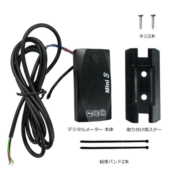 内容:デジタルメーター本体、ネジ2本、取り付けステー、結束バンド2本、両面テープ