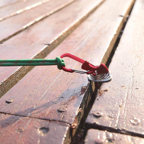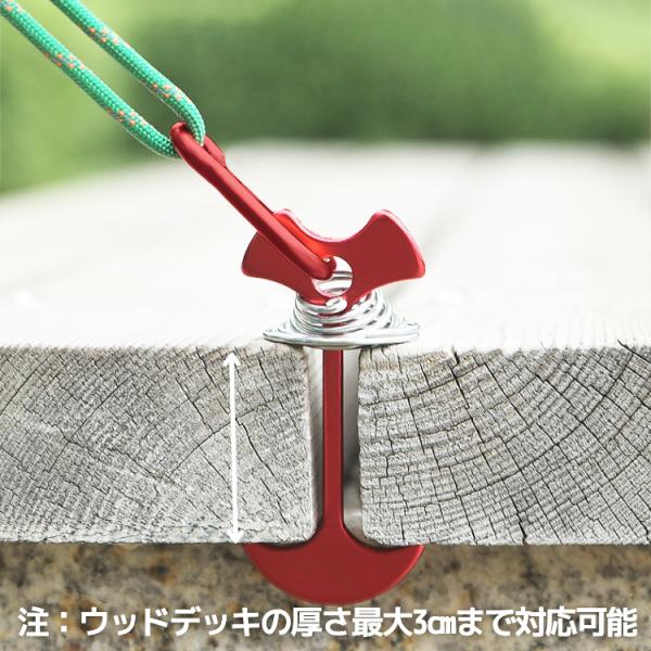 ウッドデッキには、ペグを打ち込めないのでこのアンカーペグがお勧めで御座います。 先端にカラビナを付けて、カラビナにロープを固定できます。