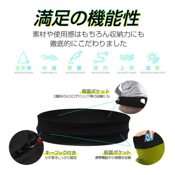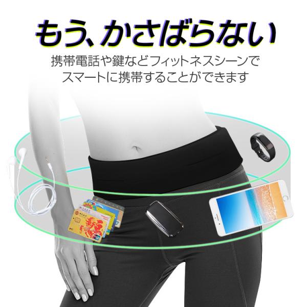 留め具やジッパーなどがなく、伸縮快適素材で体に負担が掛かることなく着用でき、前後計4つのポケットよりスマホや財布、イヤホンなどを便利に携帯することができます。