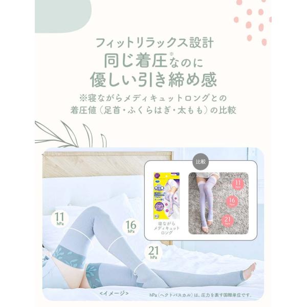 ●フィットリラックス設計 (4)同じ着圧※2なのに優しい引き締め感※2寝ながらメディキュット ロングとの着圧値(足首・ふくらはぎ・太もも)の比較。(5)着脱しやすく、簡単ケア (6)脚にフィットするのに蒸れにくい 【こんな方におすすめ】忙しい生活でストレスを抱え、心も身体もリラックスしたい方・柔らかい肌触りの素材で脚を引き締めたい方