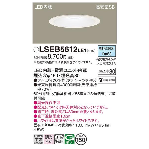 ○[法人限定][即納在庫有り] LSEB5612 LE1 パナソニック 天井埋込型 LED 昼白色 ダウンライト 浅型8H 拡散タイプ φ150【LGD1201N LE1 同等品】[ LSEB5612LE1 ]