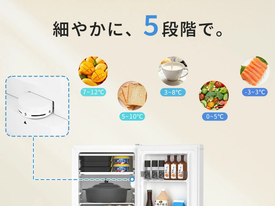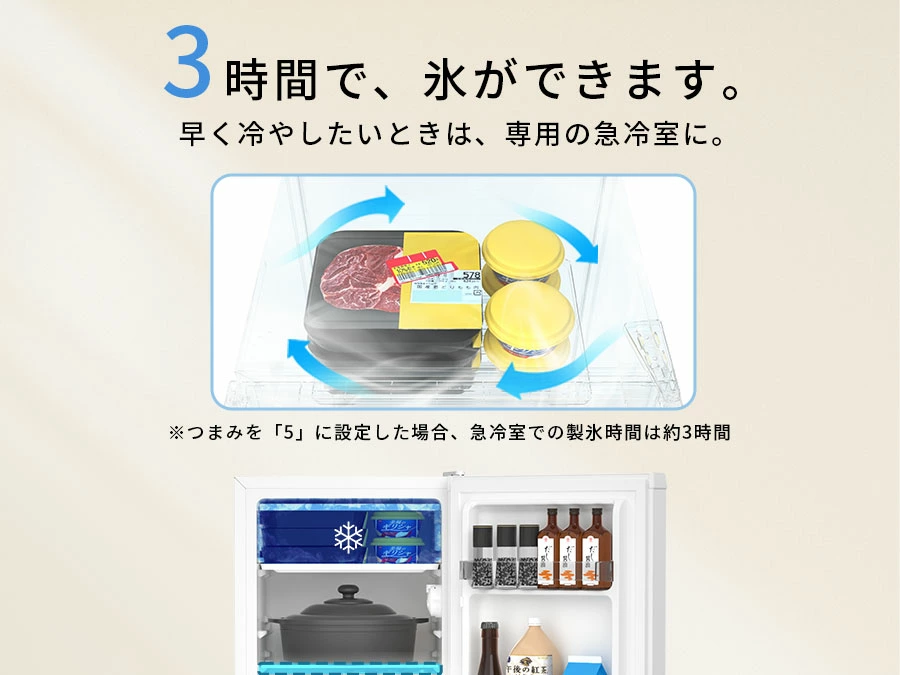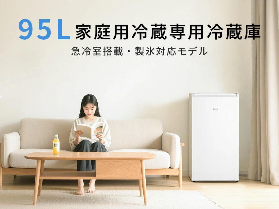 冷蔵容量はたっぷり95L。飲料や野菜、作り置きのおかずなどをまとめて保存でき、一人暮らしの方や学生、単身赴任の方にぴったりです。サブ冷蔵庫としても活躍し、メインの冷蔵庫に入りきらない分もスマートに補完できます。