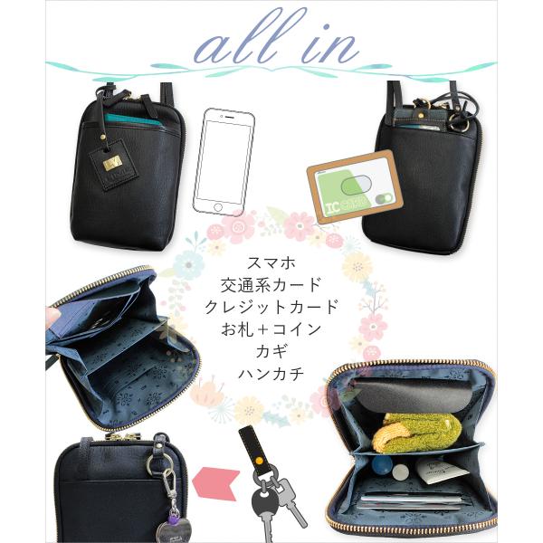 これ一つでスマホ、お金、各カード類、鍵、ハンカチ等必要最低限のアイテムをコンパクトに収納できます。