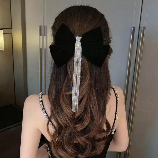 \ ラインストーン付き / ベロア リボン バレッタ ヘアクリップ ヘアアクセサリー 髪飾り 結婚式 二次会 パーティー デート キャバ ナイト ドレス 大人可愛い