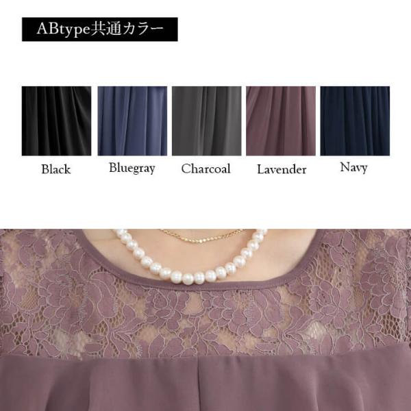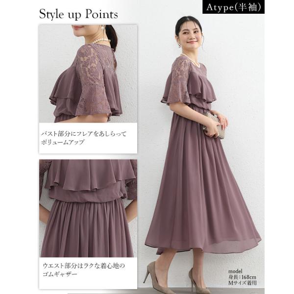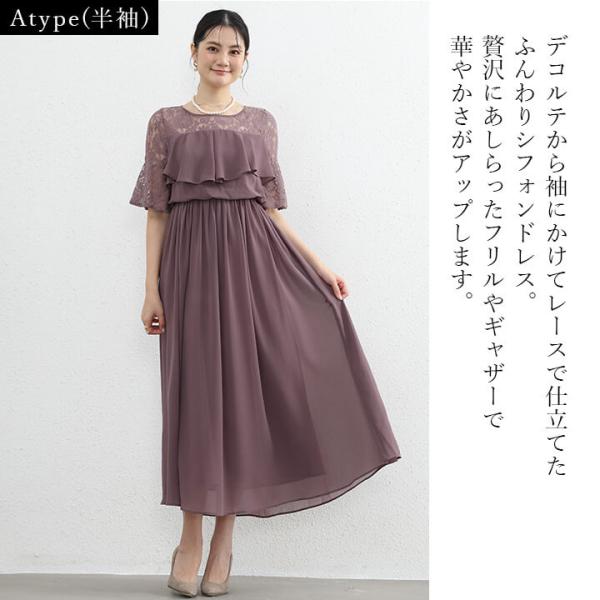デコルテから袖にかけてレースで仕立てたふんわりシフォンドレス。