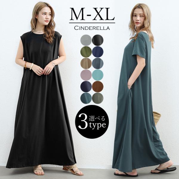 マキシワンピース Tシャツ 無地 ロンT ノースリーブ 半袖 シンプル フレンチスリーブ ワンピース 春 夏 レディース カジュアル ゆったり 春夏 ロング 黒 rt3081