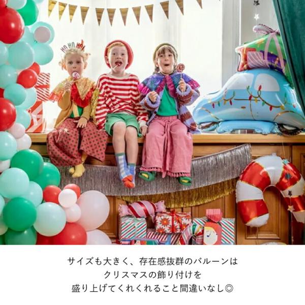 クリスマスプレゼントを背負った車の置き型風船!お子様が喜ぶ存在感のあるサイズでパーティーを華やかに演出します。膨らますだけで簡単にパーティーデコレーションが楽しめます。パーティーのメイン装飾としてお使い頂けます。