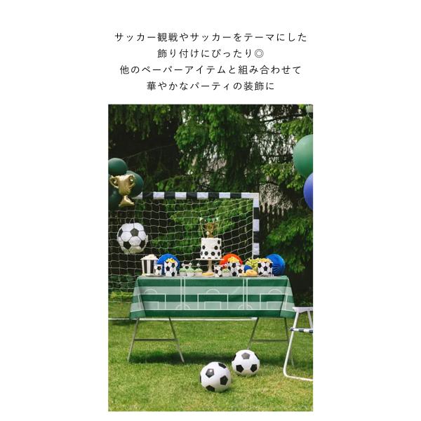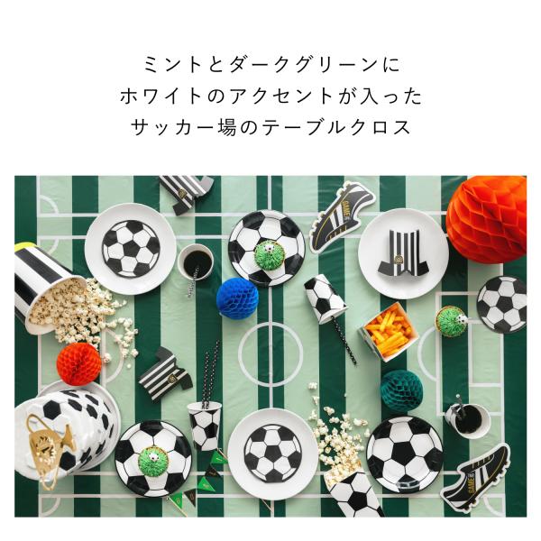 ミントとダークグリーンにホワイトのアクセントが入ったサッカー場デザインのテーブルクロス。サッカー観戦やサッカーをテーマにした飾り付けにぴったり◎他のペーパーアイテムと組み合わせて華やかなパーティの装飾に。