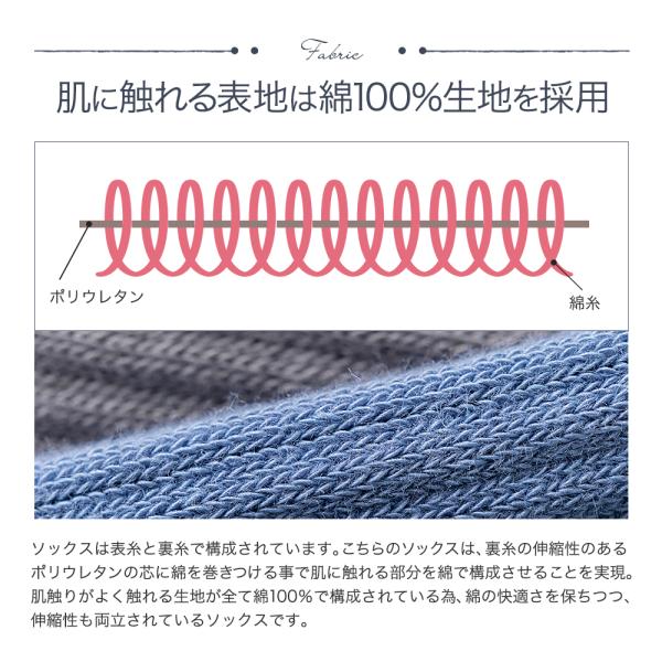 ※伸縮性の為に使用しているポリウレタン糸の上に面を巻き付けているような構造の為、実際に肌に触れる箇所は綿の糸です。