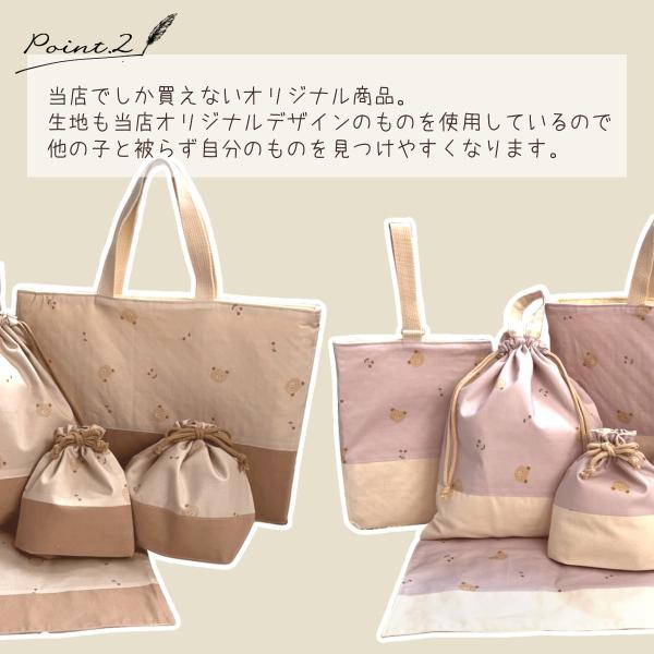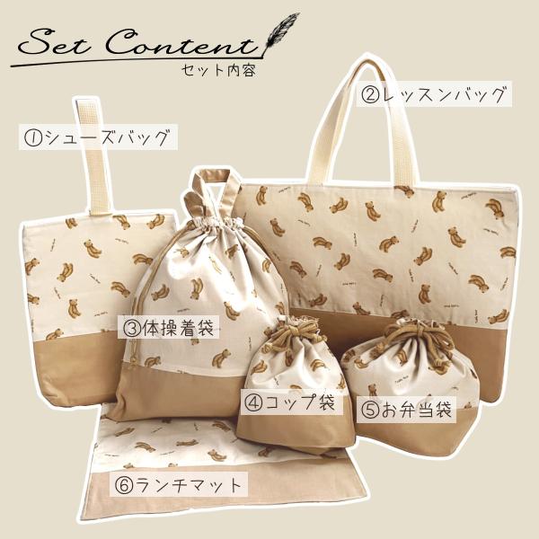 レッスンバッグ・シューズ入れ・お弁当箱・コップ入れ・ランチマットの6点セット。