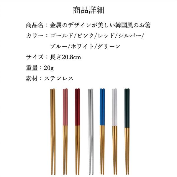 ・特徴:食洗機対応のおしゃれなお箸セット。カラフルでステンレスの光沢が美しい韓国風のお箸に仕上げています。食洗機対応なのも嬉しいポイントです。
