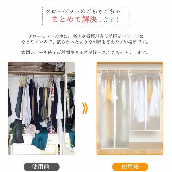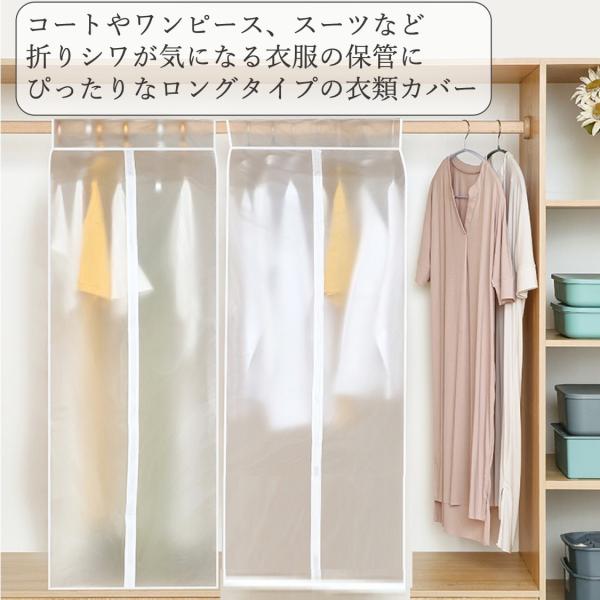 ・特徴:ハンガーラックに掛けてまとめて覆えるロングサイズの透明衣類カバー。底マチ付きで虫や湿気の侵入を防ぐことができる衣類カバーです。クローゼットや押入に吊り下げたま使えるので、ダウンジャケットやコート、スーツなどの嵩張る衣類の衣替えにもぴったりな衣類カバーです。
