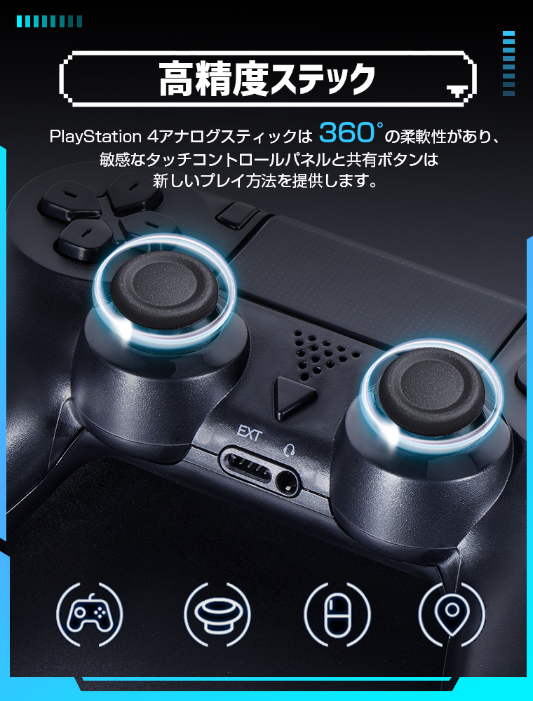 PS4用コントローラーには最新Bluetoothチップを搭載され、PS4/PS3との最大到達距離は約10m,最大伝送速度が2.1Mbpsを達しました。また、ジャイロセンサー、600MAHリチウム電池、長い稼働時間、タッチパッド、二重振動、人間工学に基づくなどの特徴を備えています。高感度のタッチコントロールパネルと共有ボタンがあり、複数人数で様々な使い方ができます。独自のデュアルショック機能が搭載され、タイムリーに振動がプレイヤーへ伝わり迫力あるプレイが可能に。注:ヘッドフォン(CTIA規格)をデバイス(OMTP規格)に接続すると、音量と音質に影響しますが、通常の使用には影響しません。