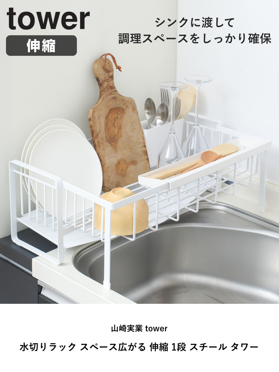 特典付き 山崎実業 tower 水切りラック スペース広がる 伸縮 1段 スチール タワー ( タワーシリーズ 水切りカゴ 水切り 大容量 コンパクト 水切りかご )