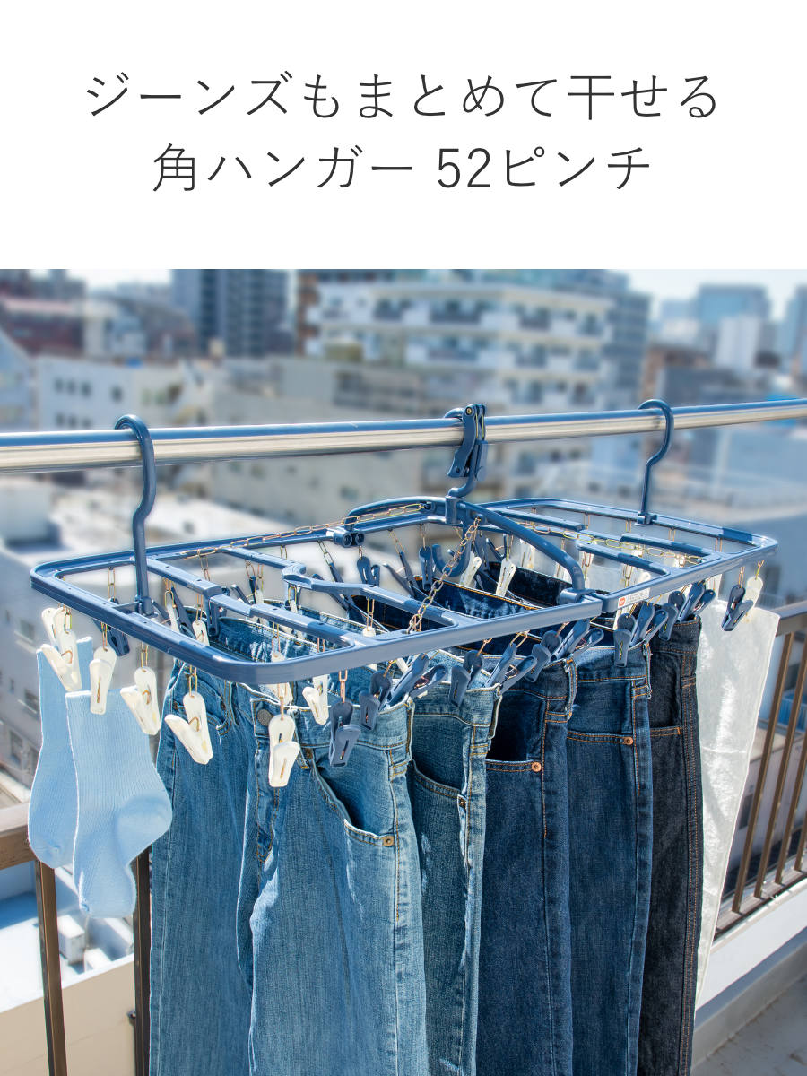 ●衣類に合わせて干し分けできる52個ピンチの角ハンガーです。