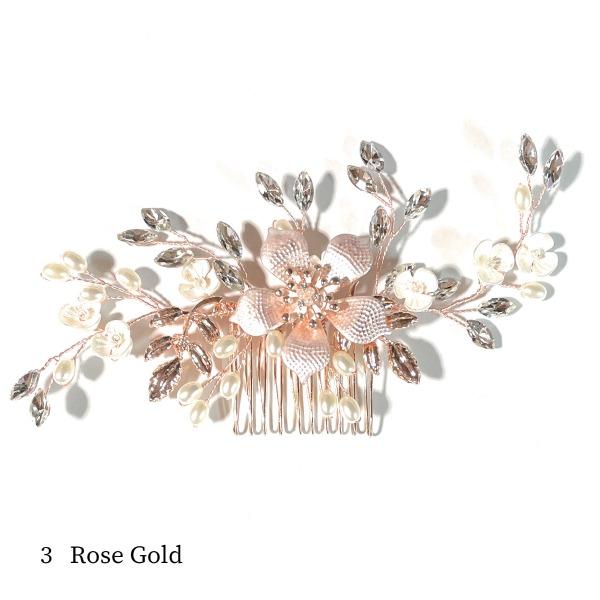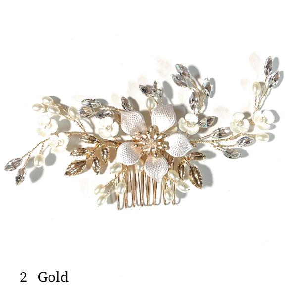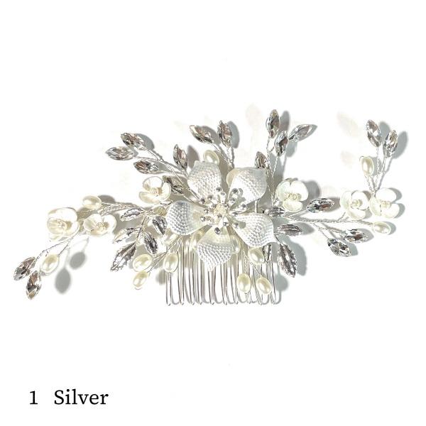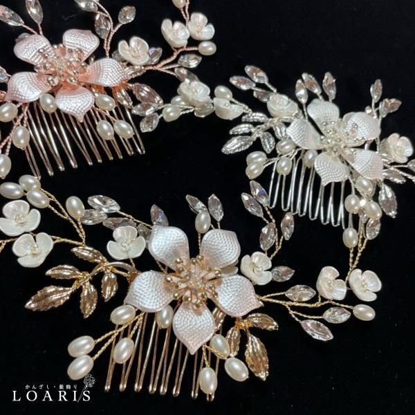 ホワイトフラワーとラインストーンリーフに囲まれた気品高いフラワーパール髪飾り。