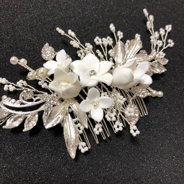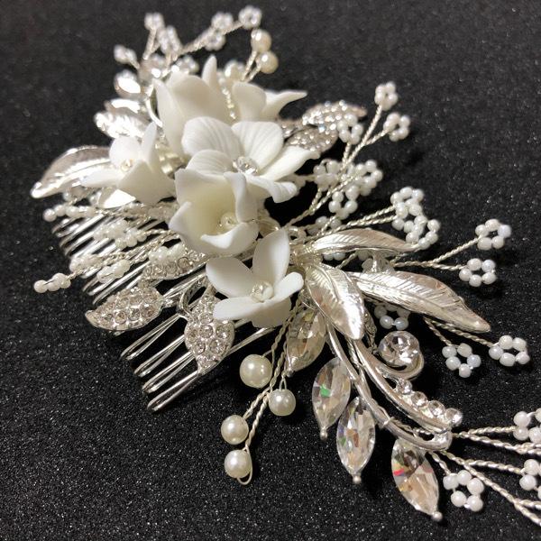 パールとラインストーンをフラワービジューをハンドメイドにて1つ1つ丁寧に繋ぎ合わせたヘッドドレス。