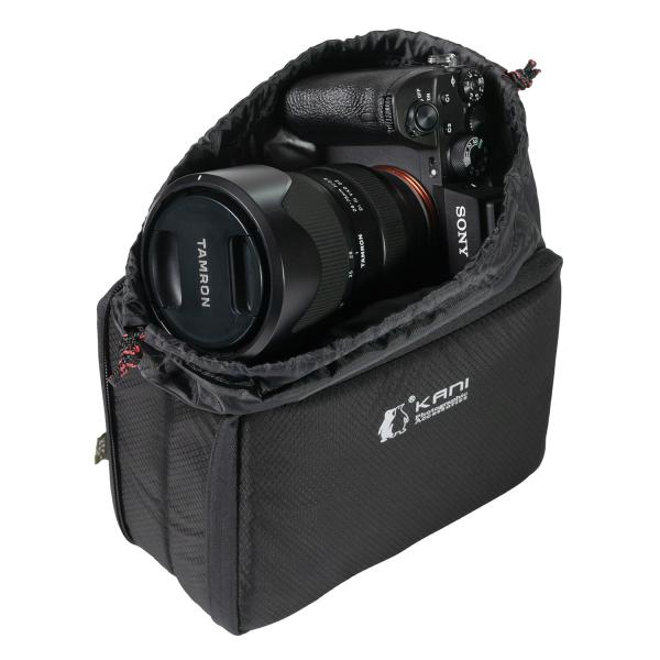 カメラバッグと同様にクッションで周囲を覆って機材をガード。内部に収納されている底板と付属の中仕切もクッション付。天蓋は巾着のように開閉できるドローコード式で多少ラフな収納でも素早くカバー。折り畳みの際に使用するファスナーはスムーズなYKKジッパーを使用。