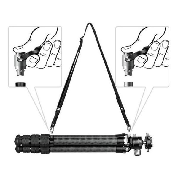 ボディ側・脚側双方に付いたアダプターに対し、三脚ストラップ両端をワンタッチで脱着できます。例えば、野外で三脚ストラップによる風の影響を防ぎたい場合など、ストラップ全体を素早く外したいシーンでは抜群の威力を発揮します。