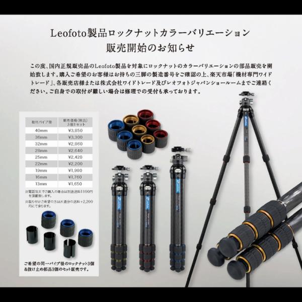 レオフォトジャパンの販売する三脚限定サービスとしてロックナットのカラーバリエーションモデル。レッド・ブルー・イエロー・グリーン・ピンク・オレンジの六色展開でひと味違った足元を演出します。