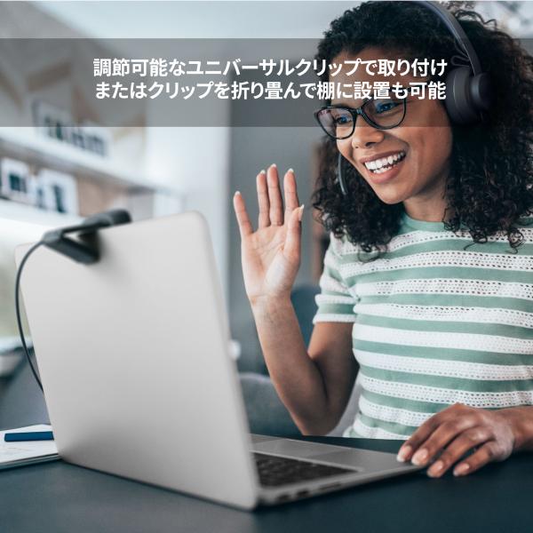 調節可能なユニバーサルクリップでスクリーンやノートパソコンカメラに取り付けることができ、クリップを折り畳んでウェブカメラを棚に設置することも可能です。また、PCに接続するだけですぐに使用できるプラグアンドプレイ型で、1.5mのUSB-Aケーブル付きです。