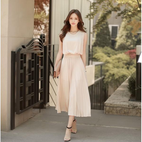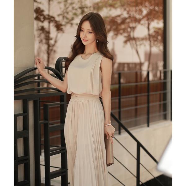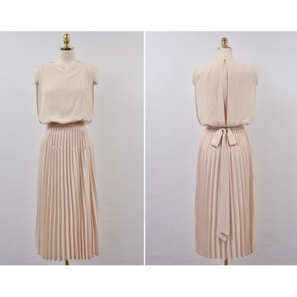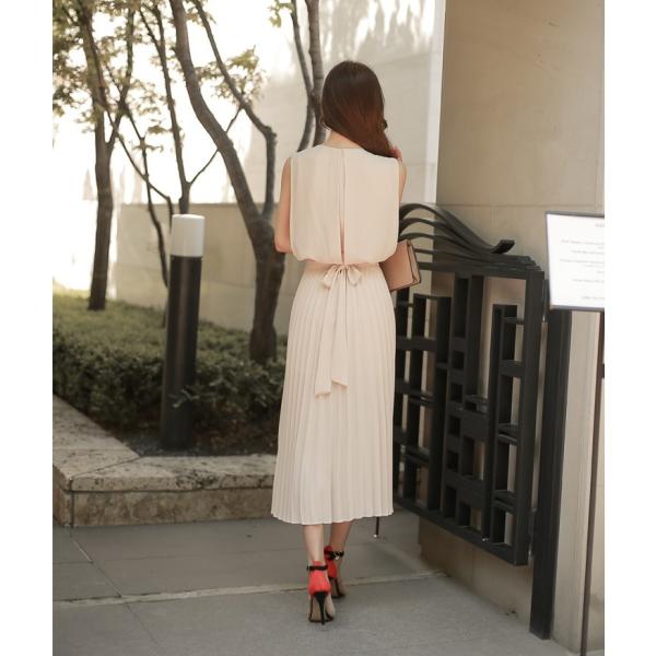 ワンピース ロング丈 マキシ丈 ノースリーブ プチプラ パーティードレス 大人可愛い プリーツスカート 丸ネック リボン付き Aライン Uネック 無地 二次会