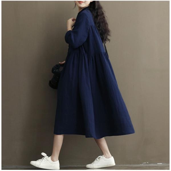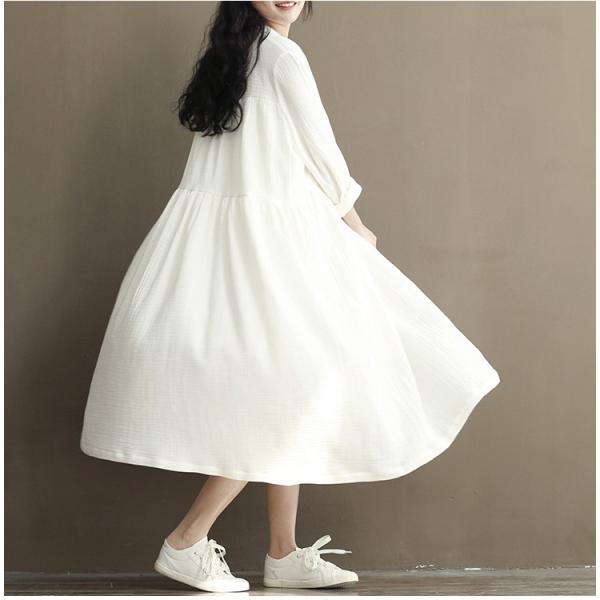 ワンピース ロング丈 長袖 ミモレ丈ワンピース ゆるふわ 清楚 秋 ワンピース リネン 白ワンピ ロングワンピース シャツワンピース カジュアル