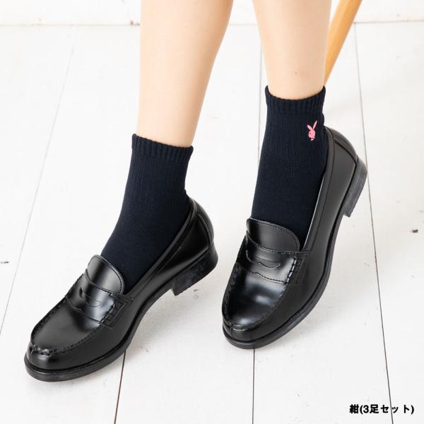 (3足セット) プレイボーイ スクールソックス アンクル丈 ワンポイント刺繍 (白・黒・紺)(23-25cm) 靴下 ショートソックス D1PK