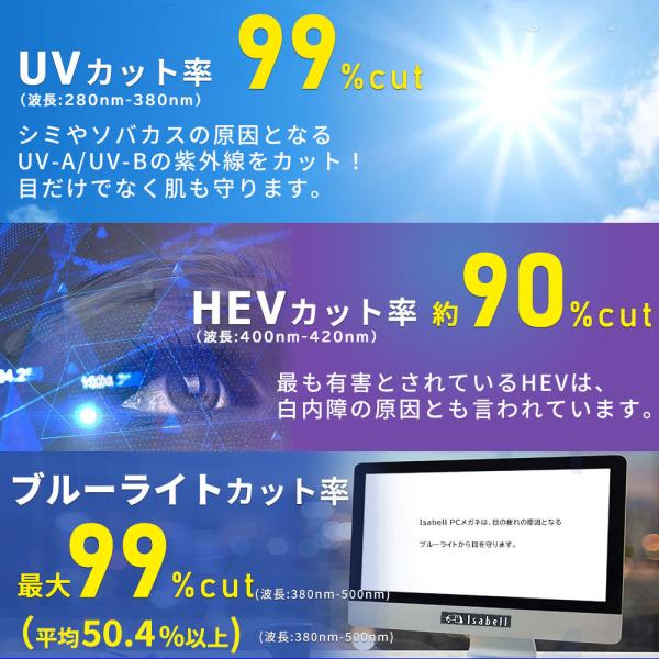 長時間のスマホやパソコンの使用は眼にダメージを与えます。ブルーライトカットメガネは、ダメージの主原因であるブルーライトをカットすることで、眼の疲労感を和らげます。また、紫外線カット機能を兼ね備えており外出先でも効力は発揮!